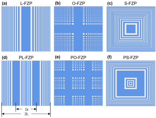 Schematic diagrams of quadrate FZPs: (a) L-FZP; (b) O-FZP; (c) S-FZP; (d) PL-FZP; (e) PO-FZP; (f) PS-FZP.