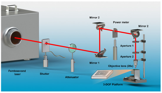 FZPs were fabricated in sapphire (Al2O3) via femtosecond laser direct writing. The femtosecond laser has an ultra-short pulse and ultra-high energy peak, which can realize non-hot melt cold processing and high-precision processing, and has a wide range of applications in micro and nano processing. The schematic diagram of the femtosecond laser direct writing experimental system is shown in Figure 3. A Ti-sapphire femtosecond laser with a pulse width of 120 fs, central wavelength of 800 nm, and repetition rate of 1 was used for laser ablation, and it was focused with a 20× objective lens (Nikon, NA = 0.4). The sapphire samples ( were placed on the 3-DOF movement platform. After processing, the morphology of surfaces was obtained by an optical microscope. The diffractive performance of FZPs was tested by a CCD and a diffraction performance test system [13].