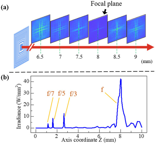The modeling and simulations of quadrate FZPs and PS-FZPs were conducted in ZEMAX (America, Zemax OpticStudio 17). Figure 4a shows the convergence process of the S-FZP for the beam (. The edge-to-center distance was set to 80 and the number of zones to 29. So, the square side length 2L is 862 μm. The simulated results showed that laser beams converge gradually from the FZP plane to the focal plane. At the distance of 8 mm from the FZP plane, the energy convergence is concentrated chiefly with a prominent bright spot and cross line in the center. The linear convergence of energy causes this in the XY direction. After 8 mm, the energy diffuses again. Figure 4b shows the energy distribution along the Z-axis after the incident light passes through S-FZP. It can be seen that the highest energy is at 8 mm, which is the main focal length of S-FZP. Meanwhile, other peaks with decreasing energies appear at 2.67 mm, 1.60 mm, and 1.14 mm. These values are the sub-focal lengths of S-FZP at , and .