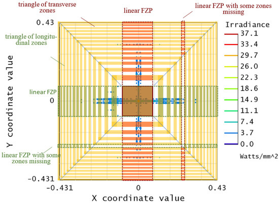 As shown in Figure 5, the process of diffraction pattern formation can be seen more clearly by superimposing the focal plane and S-FZP. Along the diagonal, S-FZP can be divided into two triangles of transverse zones and two triangles of longitudinal zones. As can be seen from the triangles of transverse zones, the middle part is a complete linear FZP, so a clear focusing line is formed at the center of the focal plane. The outer region can be segmented into linear FZPs with some zones missing. Because of the absence of the zones, the focal lines formed on the focal plane become scattered. As more zones are missing, less energy is enhanced by diffraction at the center. Therefore, the energy of the focusing line on the focal plane becomes lower and gradually disappears. The same is true of the triangular longitudinal zones. Thus, the center of the diffraction pattern of an S-FZP is a clear crosshair, and the periphery is a widened focusing line.