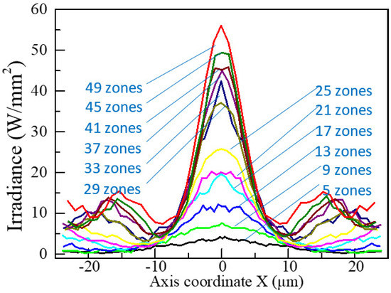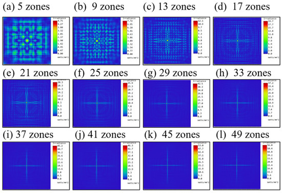 The number of zones is an essential parameter of FZPs, affecting focal point morphology and energy distribution [22]. Several S-FZPs with different zone numbers were modeled to investigate the effects of zone numbers, and the diffraction performance was obtained via ZEMAX simulation. Table 1 compares the diffraction properties of S-FZPs with varying numbers of the zone. The focal depth of FZP gradually decreases from 3 mm to 0.7 mm with increasing zone numbers. As the focal depth decreases, the focal energy gradually centralizes, and the peak power increases with numbers. Figure 6 compares diffraction patterns of focal planes of quadrate FZPs. When the number is too small, a clear cruciform diffraction pattern cannot be produced. At the same time, too many zones make the energy more concentrated at the focus. The diffraction energy of the crossline decreases, which declines the clarity of the crossline. Figure 7 shows the comparison of focal point morphology. From Figure 7 and Table 1, the focal point radius decreases gradually from 18.2 μm to 8.8 μm with the increase in the number. The radius of the focal point has an essential effect on the resolution. The smaller the radius, the higher the resolution. The resolution of S-FZP increases with the increase of the number, which is like that of circular FZP.