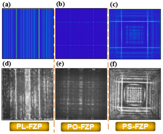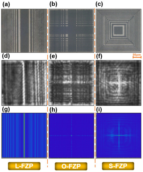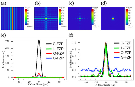 Figure 8a–d shows that the diffraction properties of quadrate FZPs and circular FZP are simulated and compared. All the energy of circular FZP is concentrated at the focus, without any other diffraction pattern. For quadrate FZPs, the light path from the region to the focus is different as the beam passes through at different locations, and therefore there are other diffraction patterns. Figure 8a–c shows simulation diagrams of L-FZP, O-FZP and S-FZP. The edge-to-center distances of the three FZPs are 80 , the numbers of zones are 29, and the main focal lengths are 8 . The diffraction pattern of L-PZP is straight, with the highest energy at the central line and a symmetric pattern of lines on both sides, with decreasing energy. The diffraction pattern of O-FZP is crossed dashed lines because O-FZP is composed of vertically crossed L-FZPs. O-FZP is segmented into several narrow linear FZPs, thus forming a series of independent and disconnected focal points arranged in a straight line.