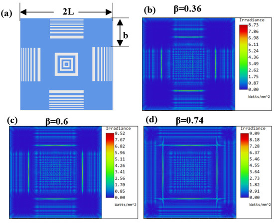 (a) Schematic diagram of PB-FZP; the diffraction pattern of PB-FZP with different values of transmittance parameter β: (b) β = 0.36; (c) β = 0.6; (d) β = 0.74.