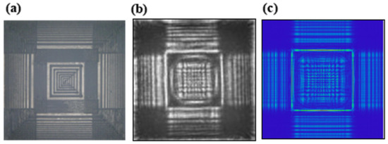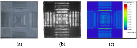 The given results proposed different values of phase shift parameter α in X and Y directions and the corresponding transmittance parameter β to obtain the rectangular diffraction pattern. Figure 13a represents the fs-laser irradiated FZPs with rectangular shapes, and Figure 13b,c shows the diffraction performance and simulated pattern. All boundaries of rectangular FZP have a bright edge in the diffraction pattern, in keeping with the simulated results. The use of parameters from square FZPs to rectangular PB-FZP proved that the focusing equation applies to all the quadrate Fresnel zone plates in designing and manufacturing.