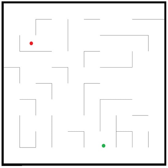 The task operation environment within a mobile robot system is a 2D plane with random generated obstacles as shown in Figure 1, for example. In this figure, the red dot and green dot are denoted as the start position and the destination position in the 2D plane, respectively. This task requires the mobile robot to start from the red dot and then reach the green dot without colliding with any obstacles. To perform this task, an omnidirectional mobile robot with a state vector