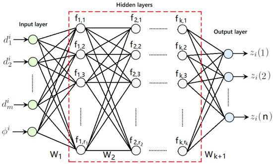 As shown in Figure 3, the model included k hidden layers in the dashed red box, and the i-th hidden layer had units. The output of the i-th layer was a vector and was transferred to the input of the -th layer as