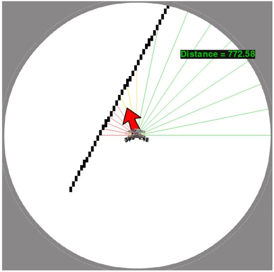 This simulator can generate various occasions with random obstacles and collect the decisions made by the human test candidates, and an exemplary situation is shown in Figure 4. As can be seen from this figure, there were 17 laser detectors, i.e., , installed on the front half plane of the mobile robot. This simulator replicated a radar with 5 m measuring distance, and each pixel in the screen denoted 0.01 m. Therefore, the maximum detection distance was set as in units of pixels. Since the laser detectors can only measure the information in the front direction, the bottom half of the circular sight in this figure was covered when recording the human user’s decisions to provide a fair navigation environment. The color of the i-th laser beam followed the mechanism