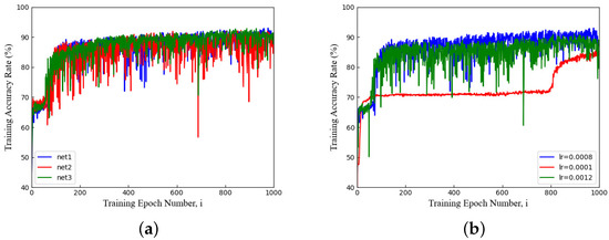 respectively. Theoretically, deepening the neural network improves the training effect, but it consumes more computing resources and increases the risk of overfitting. As shown in Figure 5a, net2 and net3 deepened the number of layers and increased the number of neurons in a certain layer on the basis of net1, but their accuracy in the test set was not improved or even reduced, and the time required for training increased. Therefore, it was considered appropriate to set the neural network to 5 layers. The learning rate determines the convergence speed of neural network, which has a great impact on the training of neural network. Too small a learning rate leads to the slow convergence speed of the neural network and increased training time while too large a learning rate results in missing the optimal solution. As shown in Figure 5b, setting the learning rate to was considered to be a suitable scheme that accounted for both the training speed and the optimal solution. Furthermore, the batch size and the total number of iterations were selected as