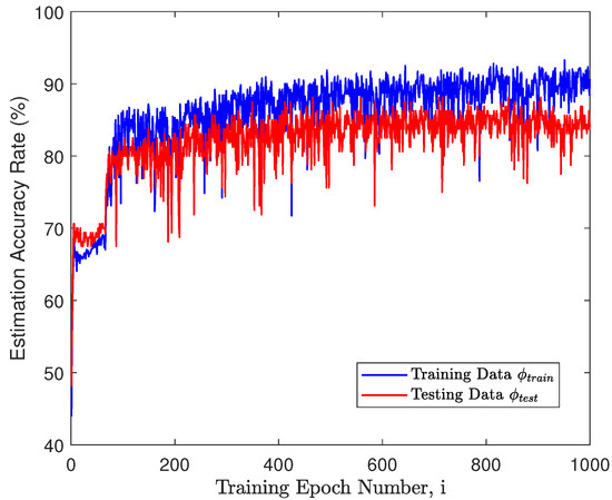 The accuracy rate is an index to judge the ability of the neural network to replicate human behavior. Therefore, the accuracy rate in and was calculated by (16) and (17) at the end of each iteration, as shown in Figure 6. The accuracy increased with the number of iterations and tended to be stable after 900 epochs, which proves that the network parameters were continuously updated and finally converged. The accuracy rate in exceeded while it reached in , which confirmed that the trained model was theoretically capable of making a decision similar to a human being based on the input information. Other alternative design parameter specifications were also tested and the final estimation accuracy rates were either lower than or similar to the above results.