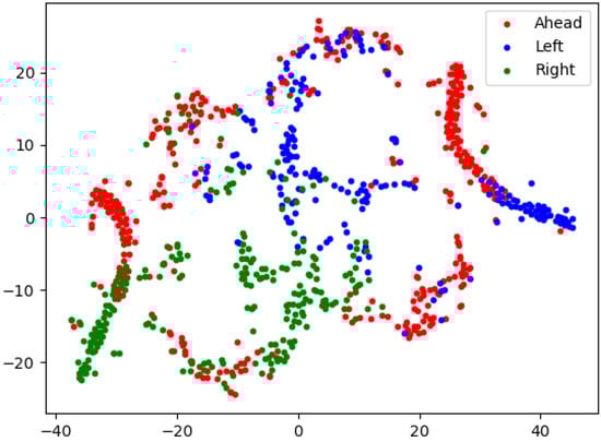 To determine why the accuracy rate could not further increase, the dimensionality reduction method called t-Distributed Stochastic Neighbor Embedding (t-SNE) was applied to convert the high dimensional elements in the database into a 2D plane for a straightforward point of view. The results are shown in Figure 7, and it is clear that the data points in some particular regions had more than one label. Therefore, the data structure was not sparse enough to allow the trained model to reach a high estimation accuracy, and it was difficult fo the model to identify the data type in those regions. This is due to the fact that there inevitably exist some occasions in which the human test candidates cannot make deterministic decisions. Therefore, the obtained performance of Algorithm 1 is acceptable in the autonomous mobile robot navigation scenario.