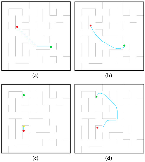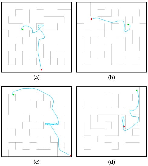 The paths of the mobile robot while performing navigation tasks using the trained neural network model in the simulator. (a) Case 1; (b) Case 2; (c) Case 3; (d) Case 4.