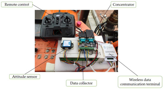 - For data collection, the serial port of the airborne ECU unit was used to directly output the front wheel steering angle, driving speed , and body attitude parameters, where the driving speed was taken as the average of the speeds of the two rear wheels. The body attitude parameters included the machinery’s three-axis angular velocity , , , the three-axis acceleration , , , and the geomagnetic relative heading angle.