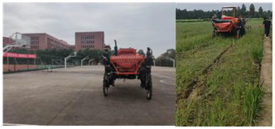 To simulate the actual running conditions of the paddy field management machine, two test environments—cement ground and a subsiding paddy field—were selected (see Figure 5).