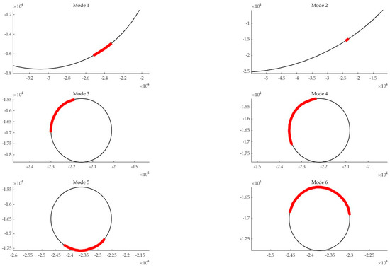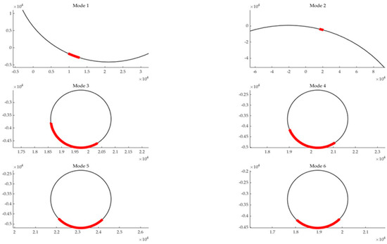 In the experiment, in two environments of cement ground and paddy field, the paddy field management machine collected the test data at two traveling speeds of 25 cm/s and 50 cm/s, and the steering control angle was divided into three cases: 0°, −10°, and +10°. According to the collected data, the least squares circle fitting method was used to fit and analyze the driving trajectory in the environment of matlab2019a to verify the feasibility and effectiveness of the equivalent steering angle prediction. A fitted track for cement ground is shown in Figure 6. The red part in the figure is the actual driving displacement of the paddy field management machine, while the gray part is the trajectory fitting circle. Modes 1, 3, and 5 are 0°, −10° and +10° steering angles at a speed of 25 cm/s. Likewise, modes 2, 4, and 6 were performed at a speed of 50 cm/s.