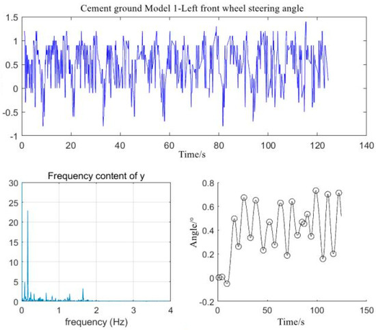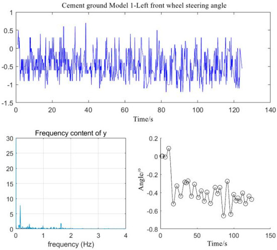 It can be seen from Figure 8 and Figure 9, that there were large fluctuations in the steering angles of the left and right front wheels (close to 2°). This deviation is similar to the free rotation angle of the front wheels, which is mainly related to the vibration of the machinery, the movement of structural parts, and the vibration due to an uneven ground.
