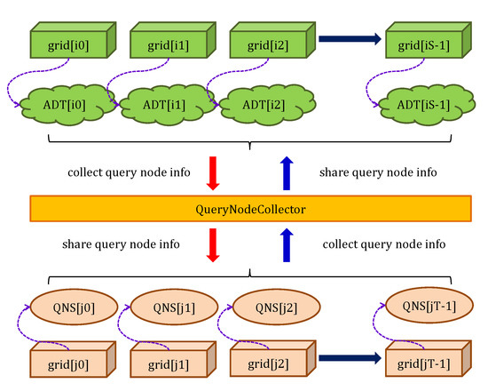 - Screening of query nodes. In each process relevant to , the information of query nodes is gathered by the collectors shown in Figure 9 and broadcasted to the T targeting processes. For an arbitrary node , if the stored process index is equal to that of current process P, then is updated in the process P. Furthermore, if holds, then p is an inactive node and excluded from .