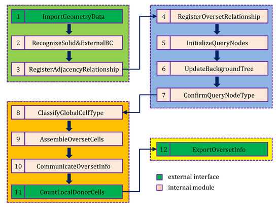 OGSM consists of three modules, i.e., the topology generation module of overlapping grids (steps 1 to 3), the parallel hole-cutting module (steps 4 to 7) and the parallel assembly module for overlapping cells (steps 8 to 11).