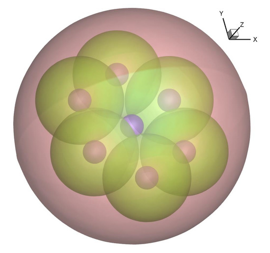 To test the capability of OGSM in the parallel assembly of overlapping multi-component grids, we applied it to a seven-sphere model, as shown in Figure 15. Unstructured grids were generated independently for each sphere component, with the geometric center coinciding with that of the respective sphere. The overlapped grids have 36,085,811 nodes and 211,912,897 volume cells in total. Each of the seven components has 4,989,826 nodes and 29,256,824 cells, while the background grid has 6,146,855 nodes and 36,371,953 cells. The overlapping grids were assembled in parallel with 32, 64, 128, 256, 512 and 1024 processes, and the relevant computation time is listed in Table 4.