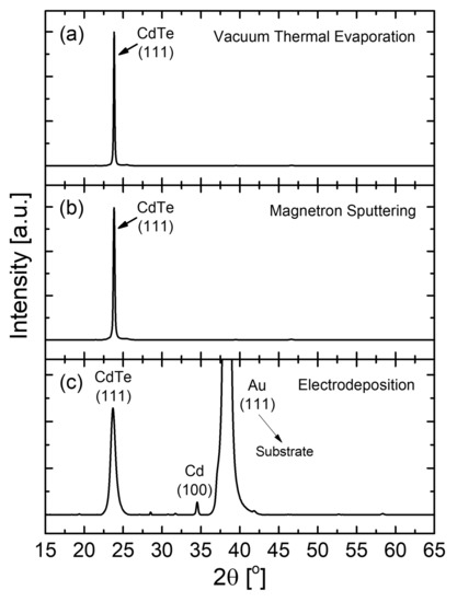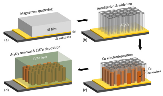 In a second stage, the prepared arrays of vertically-oriented Cu NWs were covered with thin CdTe films, employing three different deposition methods (Figure 1d): (i) vacuum thermal evaporation (VTE); (ii) radio-frequency magnetron sputtering (RF-MS); and (iii) electrochemical deposition (ECD). The evaporated CdTe thin films were obtained at a working pressure of torr, a substrate temperature of 260 C, and a source (CdTe powder) temperature of 650 C, while the evaporation time was set to 3 min using a Balzers BA 510 evaporation system (Oerlikon Balzers Limited, Balzers, Liechtenstein). The VTE process was followed by thermal treatment of the samples at 320 C for 10 min, mainly to improve the CdTe intrinsic morphology and crystallinity. For the CdTe RF-MS procedure, a commercial CdTe target (PI-KEM Limited, Wilnecote, Tamworth, United Kingdom) was employed, and the RF plasma was engaged at 90 W in an Argon (Ar) atmosphere kept at mbar for a duration of 90 min using a tectra Sputter-Coater (tectra GmbH, Frankfurt, Germany). The substrate temperature during the RF-MS process was maintained at 250 C.