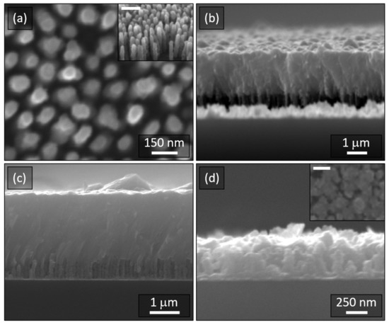 Figure 3b–d presents cross-sectional SEM micrographs of the Cu NWs supported on the Au-coated Si substrate and subsequently covered by CdTe thin films obtained by VTE (Figure 3b), RF-MS (Figure 3c), and ECD (Figure 3d). As can be seen, the evaporated CdTe film (Figure 3b) is homogeneous with an obvious intrinsic columnar nature due to the selected parameters employed in the VTE process, which favored growth along (111) crystalline plane of the “zinc blende”-type structure of CdTe, as reported elsewhere [37] and as confirmed later by XRD analysis. However, the anisotropic behavior of the CdTe evaporation process, with a high associated deposition rate (∼700 nm/min), determined the formation of a ∼2.1 m-thick CdTe thin film in a relatively short time of ∼3 min, as directly measured by SEM. Consequently, as can be observed in Figure 3b, the penetration depth of the CdTe through the Cu NWs was observed to be extremely low, rendering the method rather unsuitable to properly fill the gaps in the Cu NW array.