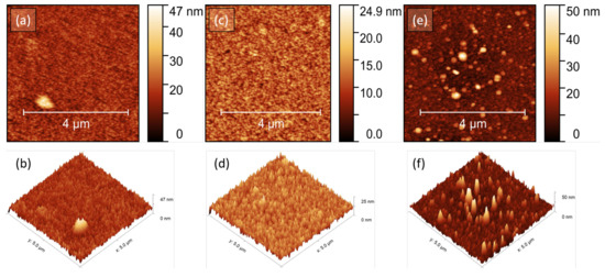 Atomic Force Microscope (AFM) top-view (a,c,e) and corresponding three-dimensional (3D) surface profile (b,d,e) of the CdTe films surfaces deposited by VTE (a,b) and RF-MS (c,d) on a pristine optical glass substrate and by ECD (e,f) on an Si substrate previously coated by a thin Au layer.