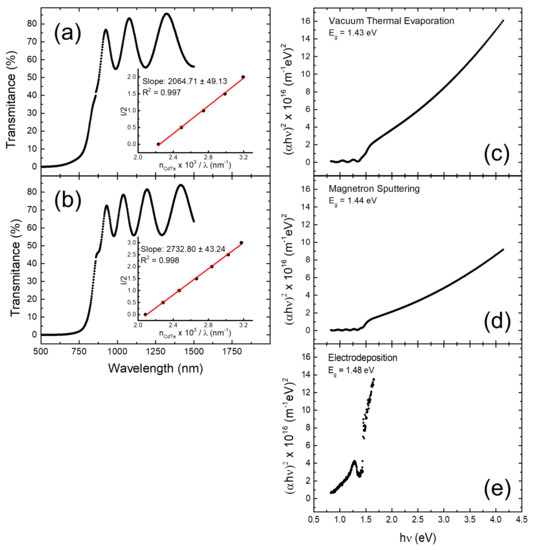 where l = 0,1,2,…,n is the refractive index, h is the CdTe film thickness, is the wavelength associated with a minimum or a maximum, and m is the unknown order of the first interference fringe [43]. The evaluated thickness values of the deposited CdTe films were (1032 ± 24.5) nm for the VTE sample and (1366 ± 21.6) nm for the RF-MS sample (see Table 1 and Table 3), where the errors were estimated from the standard errors (SEs) of the linear regression fits (see the insets of Figure 7a,b, respectively). These values were similar to those evaluated by cross-sectional SEM analysis, proving the computation accuracy of the optical spectroscopy method. The thickness of the ECD-prepared CdTe film was only estimated by direct SEM inspections (with the SE calculated over multiple SEM measurements), due to the extremely low transparency of the Au-coated Si substrate used here, in the spectral range of 500–1500 nm.