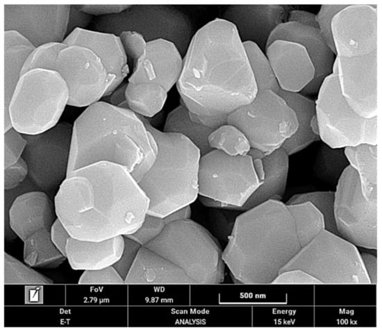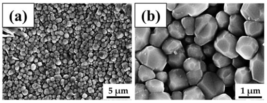As a raw material, we used Nd2Fe14B powders with high residual inductance (9.15–9.35 kG) and low intrinsic coercivity (6.8–7.8 kOe), which were fabricated by employing a proprietary rapid solidification process followed by a milling process and heat treatment. Microstructures of specimens were examined with scanning electron microscopy (SEM). Figure 1 shows an SEM image of the Nd2Fe14B powders. The Nd2Fe14B powders have an irregular shape with an average particle size of approximately 500 nm.