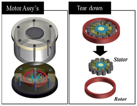 Nd2Fe14B bonded magnets with 100 ea were magnetized with a magnetized yoke to produce each condition. Each of the magnetized Nd2Fe14B magnets was used to manufacture a motor. The magnetized yoke was analyzed through a non-destructive analysis procedure. Additionally, magnetic properties of the magnetized yoke and magnetized magnet were analyzed using a surface flux meter. The motor was fabricated using the magnets magnetized with the respective magnetizing yokes, and the correlation between the magnetizing yoke and the motor characteristics was analyzed. Figure 2 shows the schematics of motor assays and tear-down images of motor indicating stator and rotor (Nd2Fe14B bonded magnets).