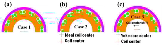 In order to confirm the influence of the magnetic flux emitted from the yoke at the time of magnetization, three kinds of magnetization yokes (cases 1 to 3) were designed and are shown in Figure 4. In case 1, the center of the yoke core and the center of the coil were designed to be the same and are shown in Figure 4a. In order to confirm the effect of the magnetizing coil that emits the magnetic field at the time of magnetization, the center of the yoke core and the coil were designed to be the same, and the center of each coil was designed to have a deviation of 100 μm in the radial direction. This condition is shown in Figure 4b. For case 3, the center of the coil was designed to have a deviation of 50 μm from the center of the yoke core and is shown in Figure 4c.