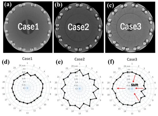 The designed yokes were fabricated and then subjected to 3D non-destructive analysis with an X-ray, as shown in Figure 5. In case 1, we can confirm that the yoke core and the coil core coincide with each other, as seen in Figure 5a,d. In case 2, the position deviation of each coil is 100 μm in the radial direction, and is shown in Figure 5b,e. In case 3, the center of the coil was shifted to the left by 50 μm, as shown in Figure 5c,f.