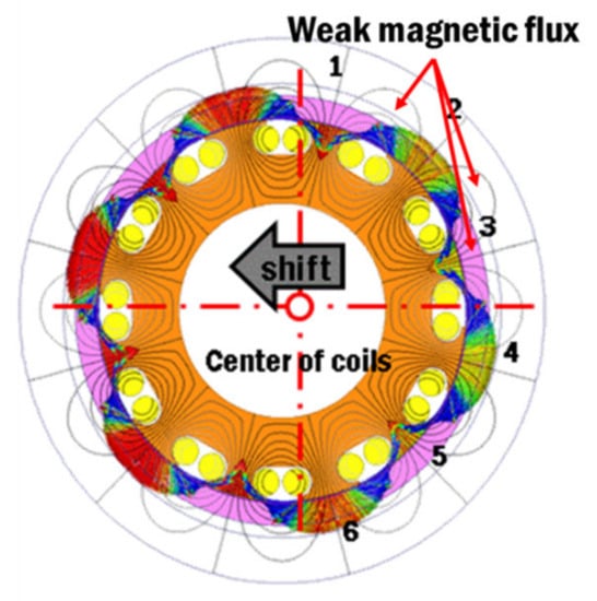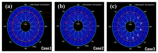As a result of the magnetic field simulation for the design conditions in case 3 (Figure 9), it was confirmed that the low flux was emitted at poles 2 to 6. The simulation results are consistent with the surface magnetic flux density analysis results.