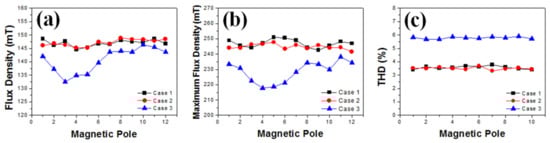 For a more accurate analysis, we analyzed the flux density, maximum flux peak value, and total harmonic distortion (THD) generated at each pole of the magnet magnetized using the magnetized yoke in cases 1 through 3, as shown in Figure 8 [13]. It can be seen that a constant flux density of 150 and 147 mT is generated in all the poles of the Nd2Fe14B bonded magnet magnetized with the yokes in cases 1 and 2, as seen in Figure 8a,b. However, in case 3, the magnet density of 135 mT can be observed at magnet poles 2~6, as in Figure 8c. As a result of the maximum flux peak analysis, it was confirmed that the maximum flux peaks of the magnets in cases 1 and 2 were similar. In case 3, we were able to confirm the low flux peak at the 2~7 pole. This finding is due to the non-uniform flux from the magnetized yoke because of the shift at the center of the coil. As a result of THD analysis, the THD value of the magnet that was magnetized with the yoke in case 3 (6.2%) is much higher than those magnetized with the yoke in cases 1 and 2 (3.5%). If the flux distortion of the magnetization of the magnet is increased, the efficiency of driving the motor for a long time is lowered, which can generate noise. The shift in the yoke coil creates a pole with a non-uniform magnetic flux of the Nd2Fe14B magnet, so that the deviation of flux peak and density becomes very high.