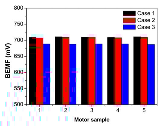 If the current applied to the stator core is constant, the back electromotive force is correlated with B, the flux value of the rotor, which is the Nd2Fe14B permanent magnet magnetized in Equation (2). Therefore, in cases 1 and 2, where uniform flux is generated at each yoke pole, a uniform flux is formed in the entire rotor, and the equivalent BEMF value of 710 and 708.6 mV can be confirmed when the motor is mounted. However, when the magnets were magnetized with the yoke in case 3, which had low magnetic flux values at poles 2 to 7, and the forces were applied to the rotor, a low BEMF value of 688.4 mV was confirmed.