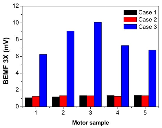 In addition, Figure 11 shows the measurement results for back EMF (3×) that were generated during the motor operation [16,17]. In general, the value of BEMF (3×) indicates the discrepancy between the physical rotation of the rotor and the electrical rotation. As a result of the analysis of the BEMF (3×) value of the motor using each rotor with a black rotor, it was confirmed that the motor using yokes in cases 1 and 2 measured 1.25 and 1.28 BEMF (3×). However, in case 3, where a non-uniform magnetic flux emission was confirmed, a high BEMF (3×) value of 7.87 was obtained.