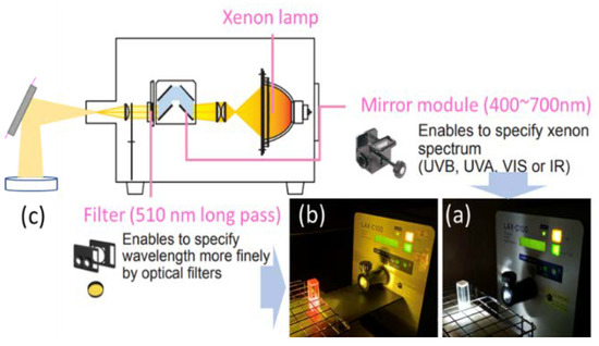 Schematic diagram of light source conditions. The proprietary mirror module (400~700 nm) with only the desired wavelength range (white light) from the xenon light source (a). The system could also emit 510~700 nm by the bandpass 510 nm filter (b). The 15 mW/cm2 light power was output to the dish surface (c).