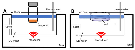 As shown in Figure 2, ultrasonic water baths (frequency is 42 kHz, power 35 W) as the energy source of ultrasound (US) were applied for spectral and cell disk measurements, respectively. Prior to ultrasound exposure, the cell-containing culture plate was placed on a platform and then immersed in a tank (0.5 W/cm2 with a frequency of 1.7 MHz in continuous waves) containing degassed water (16 × 4.5 cm). A transducer emitting plane waves with 48-mm-diameter was fixed at the bottom of the tank, allowing the ultrasound beams to point upward. The distance between the bottom of the culture plate and the transducer was 2.5 cm.