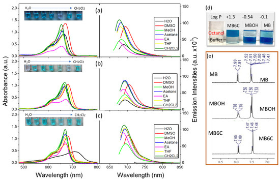 Absorption (left) and emission (right) spectra of 15 μM concentrations of the compounds MB (a), MBOH (b), and MB6C (c) in different solvents. Excitation wavelength emission spectra are depicted as absorption maxima. The partition ratios diagram of octanol/buffer solutions (d) and the comparison of the NMR chemical shifts (aromatic region) for these three molecules (e).