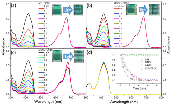 Absorption spectra variations of DPBF mix (a) MB, (b) MBOH, and (c) MB6C in DMSO under an irradiation environment, as described in the experimental section. The control experiment without adding a compound is shown in (d), and the insert shows the comparison of DPBF oxidation rates by singlet oxygens of the above experimental results.