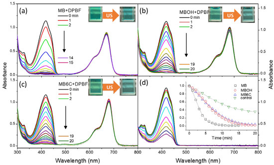 Absorption spectra variations of DPBF mixing (a) MB, (b) MBOH, and (c) MB6C in DMSO under an ultrasound environment. The control experiment without adding a compound is shown in (d), and the insert shows the comparison of DPBF oxidation rates by the singlet oxygens of the above experimental results.