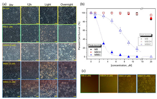 (a) Several extracted bright-field photodamage photographs from A549 lung cancer cells incubated with or without phenothiazine derivatives, 5 μM MB, MBOH, and MB6C and 3 μM of MB6C, for 12 h in order to check the dark toxicity. Then cells were irradiated with an average 18 J·cm−2 of light source (510 nm lp) for 20 min and cell deaths were estimated after a further 12 h. (b) Dark toxicity and phototoxicity cell viability plots of A549 cells treated with variable concentrations of phenothiazine derivatives, as in the experiment in (a). Each datapoint is the average from three separate experiments. (c) Fluorescent photodamage images extracted from experiment (a) to check the cellular uptake for every compound in (a).