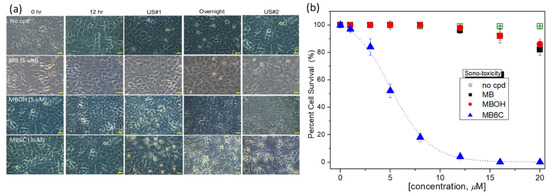 The above results suggest that MB6C is a potential reagent for studying intracellular photosensitization, the oxidative stress of PDT. Meanwhile, we expect that MB6C should exhibit more efficient SDT than MB and MBOH. Following to the incubation of the cells with MB6C for 24 h and the exposure to ultrasonication for 20 min and then culture overnight, Figure 7a shows that the cells exhibit different morphologies and become somewhat condensed. A further cell death occurs after repeating one cycle of ultrasonication and incubation (total: ultrasonicate then incubation overnight ×2). The EC50 values for SDT of MB6C are ~5 μM and ~1.5 μM for one and two cycles of ultrasonicated treatments, respectively. Herein, the ultrasound power must be adjusted to avoid damaging the cells without molecular incubation. There is no doubt that MB6C is a potential reagent for SDT. Table 1 shows the dark toxicity, phototoxicity, and sonotoxicity of the phenothiazines in A549 cells after 12 h of incubation.