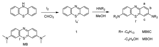 Methylene blue (MB) was purchased from Alfa Aesar. 1,3-Diphenylisobenzofuran (DPBF) was purchased from Aldrich Chemical Co. All of the solvents were of spectrometric grade. In this study, the highest-grade general chemicals were employed that obtained from Acros Organic Co., Merck Ltd., or Aldrich Chemical Co. and used without further purification. All compound and DPBF stock solutions (10−2 M) were kept in the dark at 4 °C until use. Molecular 3,7-bis(di(2-hydroxyethyl)amino)-phenothiazin-5-ium iodide (MBOH) and 3,7-bis(dihexylamino)-phenothiazin-5-ium iodide (MB6C) were synthesized as shown in Scheme 1. All the spectra for identifying compounds are listed in the supporting information (Supplementary Materials Figures S1–S6)