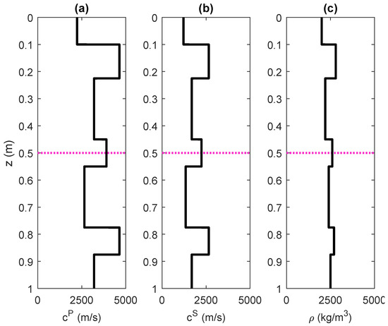 Example of a layered elastic medium with (a) P-wave velocity (in m·s), (b) S-wave velocity (in m·s) and (c) density (in kg·m) as a function of depth z (in m). Above = 0 m and below = 1 m, the medium is homogeneous. The dashed magenta line indicates the focusing depth = 0.5 m, where a virtual source is to be constructed.