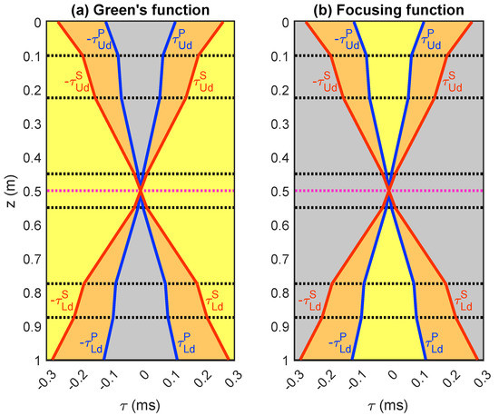 Symmetrized causality cone of (a) a Green’s function ( or ) and (b) a focusing function for the medium in Figure 1 at p = 0.2 ms·m, with the source/focal depth at = 0.5 m (indicated by the magenta dashed line; the black dashed lines indicate layer boundaries). The blue lines denote the travel times and of the direct (non-converted) P-wave transmissions. The red lines denote the travel times and of the direct (non-converted) S-wave transmissions. All wavefields are stricly zero in the gray areas (whereas they may be non-zero in the yellow and orange areas). The areas where the Green’s functions and focusing functions can overlap are indicated in orange.
