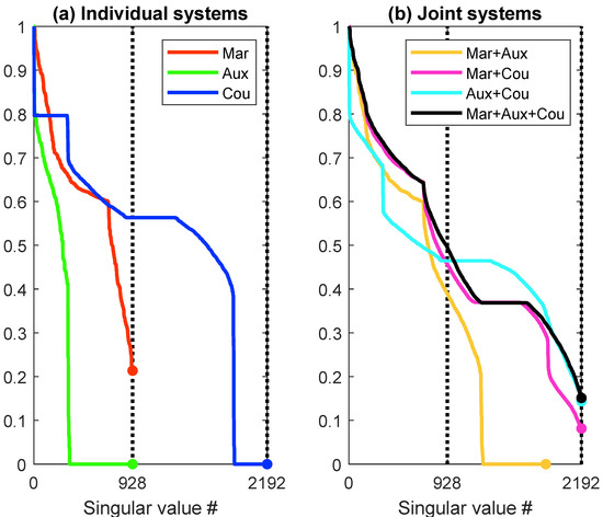 (a) Singular values of the matrices (size: ), (size: ) and (size: 16,384 ) for the model in Figure 1 at p = 0.2 ms · m. (b) Singular values after concatenating various combinations of the matrices in (a). All curves have been normalized with respect to the highest singular value. The dots indicate the lowest singular values in the matrices.