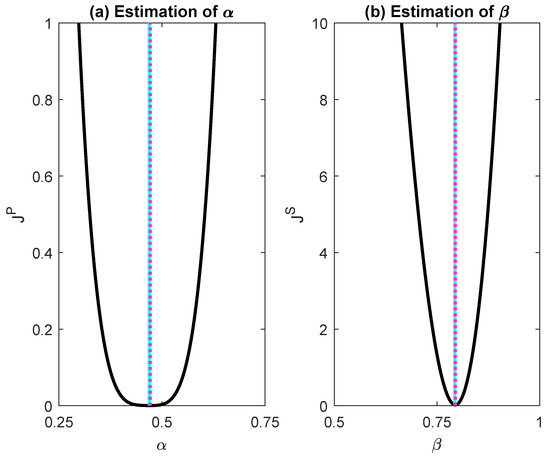 Cost functions (a) and (b) for our numerical data. The dashed magenta lines denote the minima, (for ) and (for ), that were found using Matlab’s routine. The solid cyan lines denote the exact values (for ) and (for ), as extracted from the reference data.