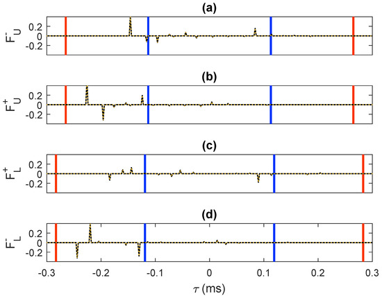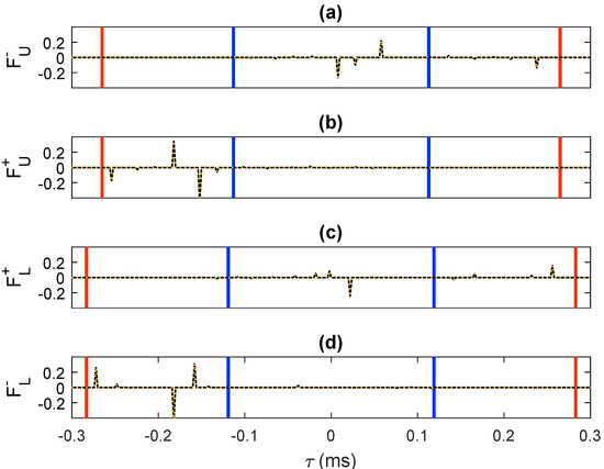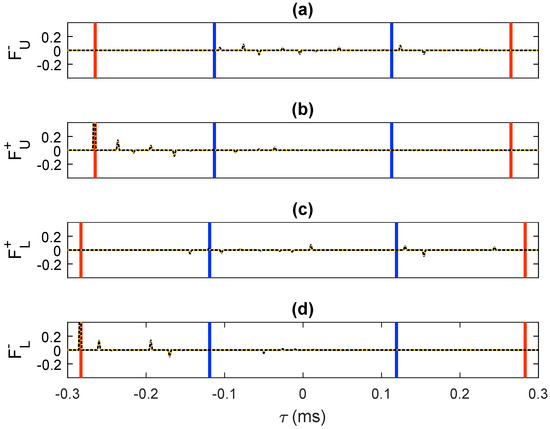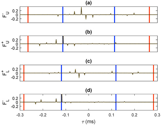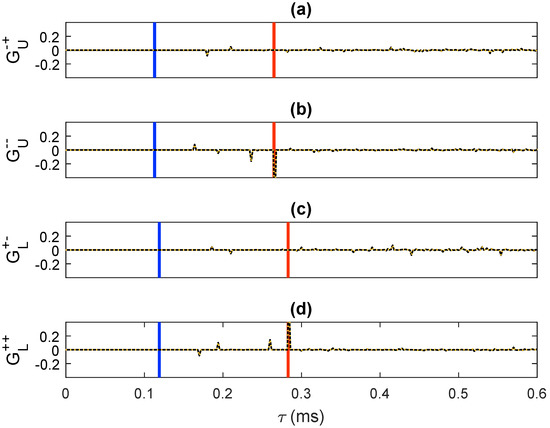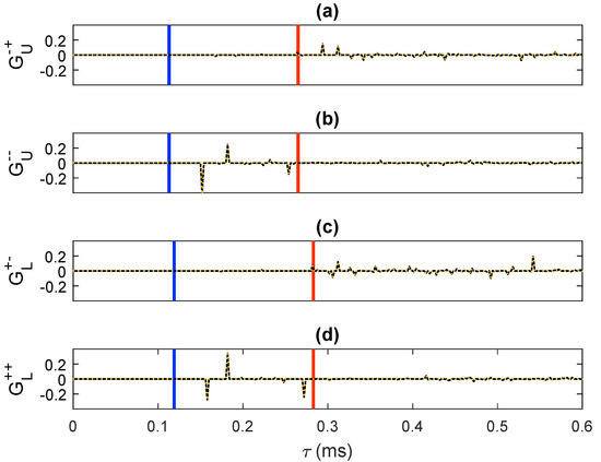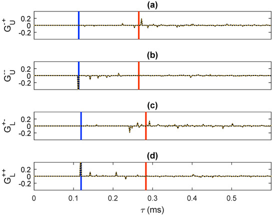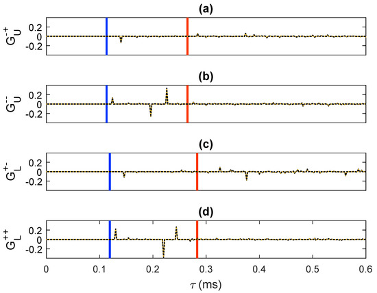 -component of the retrieved focusing functions: (a) , (b) , (c) and (d) . The solid black traces were computed via direct modeling. The dashed orange traces were retrieved by means of our methodology. The blue lines have been drawn at (where s denotes the intercept time sampling) to visualize the interval . The red lines have been drawn at to visualize the interval .