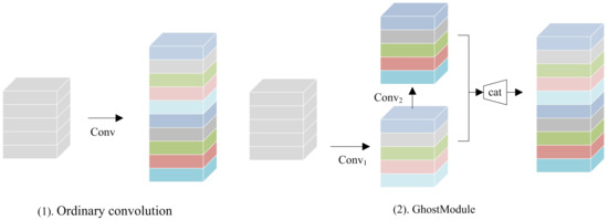 In the above equations [25], , , the in Equation (1) represents the ordinary convolution, that is, the filter number is the number of output channels ; each filter contains a number of kernels equal to the number of input channels . In Equation (2), represents the normal convolution; the number of filters is . represents a cheaper convolution with fewer parameters; the number of filters is and .