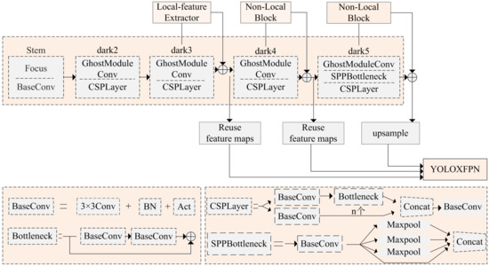 In the backbone network of the model, the shallow convolutional layer will obtain feature maps with richer detail information, so the feature extraction module of local images is placed in the lower layer so that the feature map of a single channel can receive more attention from the convolutional kernel. The deep feature map has rich semantic information, so the operation module of non-local operation is designed in the deep layer to enrich the semantic information of the feature map. Based on the backbone network of YOLOX-S, the internal structure of the improved YOLOX-S is shown in Figure 4.