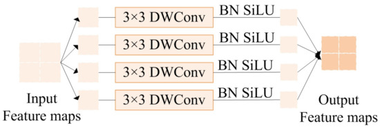 - Local extraction feature module: local-feature extractorThe local-feature extractor performs chunking and feature processing on the input feature maps; the specific structure is shown in Figure 5, where the 3 × 3 is the deep convolution. The feature map of the lower layer is rich in detailed information, and considering that the feature map near the initial input end experiences fewer convolution layers, there will be too much noise, meaning that the detailed information of the deep feature map is lost, so the feature extraction module of the local image is added to the middle layer in the backbone network. In the local-feature extractor, the feature map is chopped to obtain four patches of the same size , where , indicating four patches. After passes through the depthwise convolution, BN layer, and activation layer sequentially, it is returned to the size of according to the position of the original patch before chunking. In the local-feature extractor, the local image receives the attention of a single convolution, and the whole feature map no longer shares the same convolution kernel parameters, facilitating the extraction of detailed information in the image. This is be helpful for the detection of small objects;